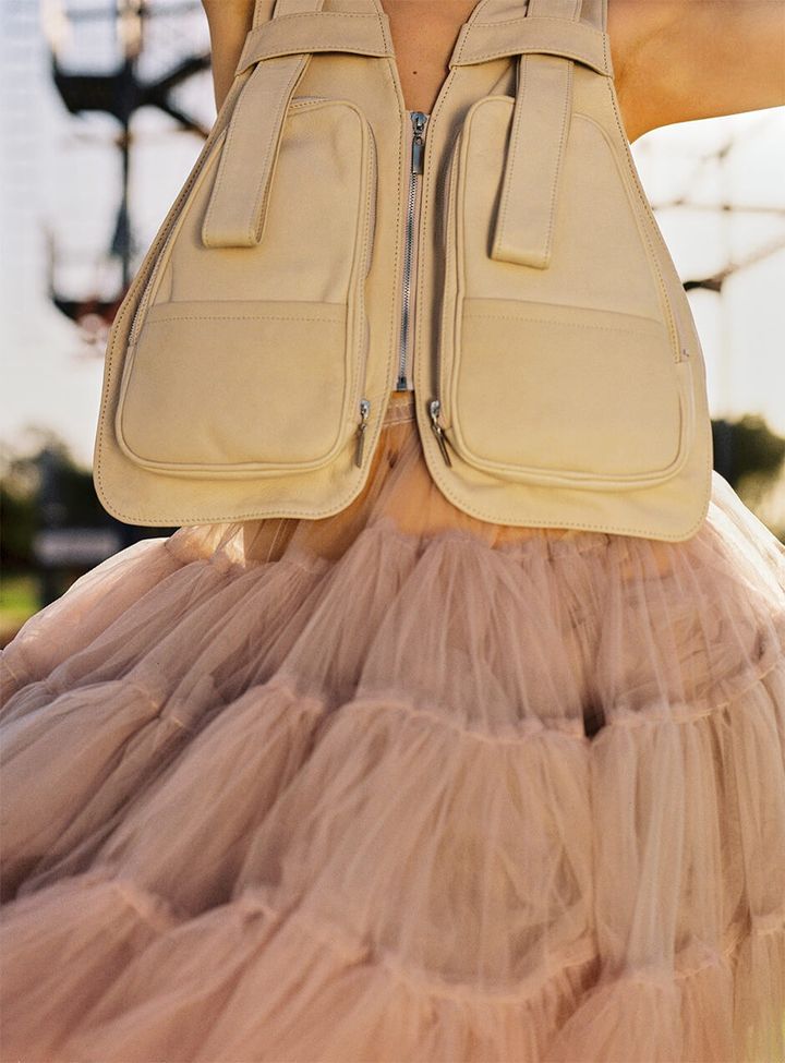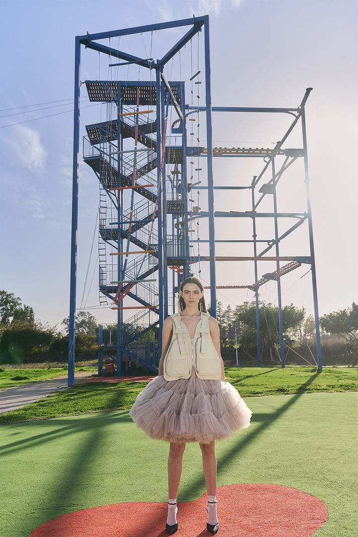 vest by HENRY KLUZNER, skirt by TAMAR JACOBY, earrings by ELEMENTS BY TAL MAN, socks and shoes stylist’s own