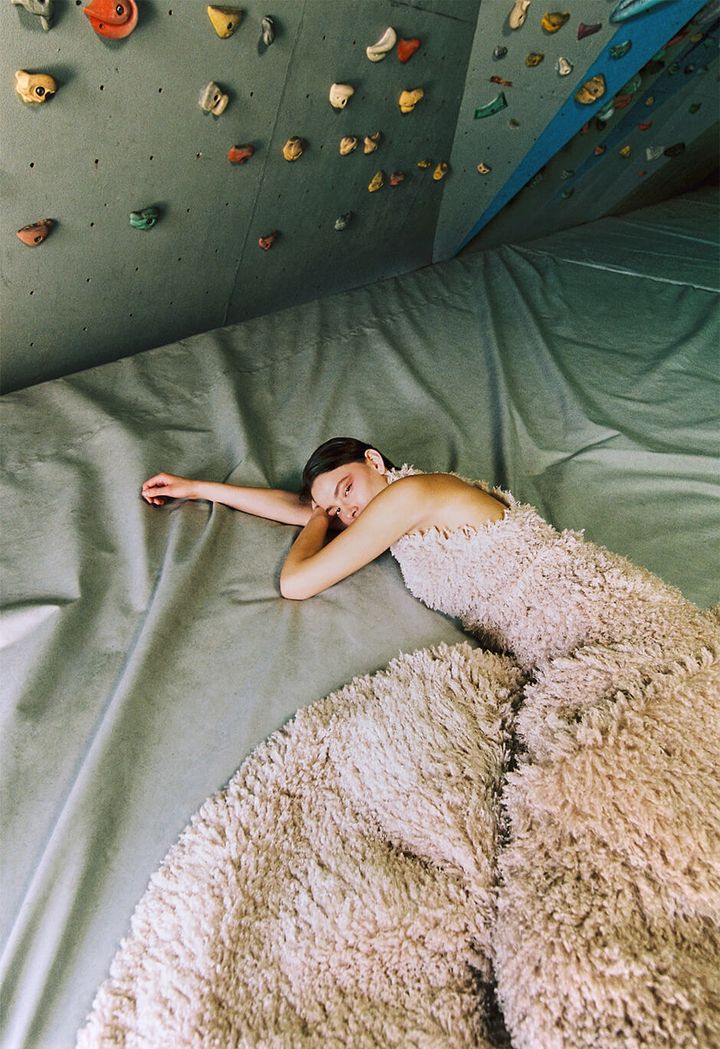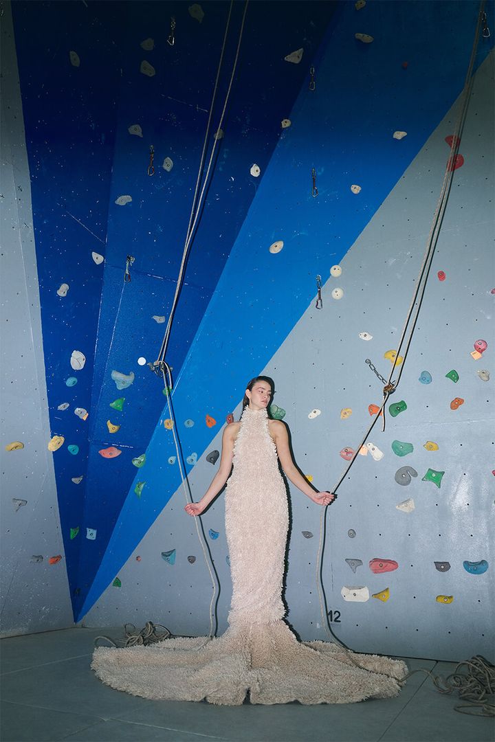 その結果、イブニングドレスがクライミングロープと絡み合い、モデルがエレガンスと肉体的挑戦のバランスをとり、衣服が光やレンズだけでなく重力そのものによって試されるという、ファッションと空間の両方を再定義するダイナミックなヴィジュアルストーリーが生まれました。