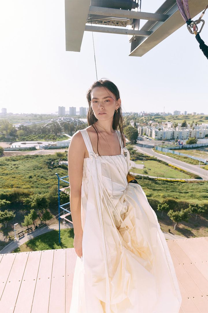 The result was a dynamic visual narrative that redefined both fashion and space, where evening gowns tangled with climbing ropes, the model balanced elegance and physical challenge, and garments were tested not just by light and lens, but by gravity itself.