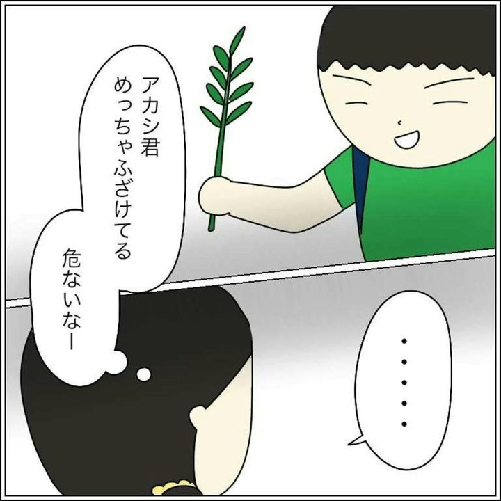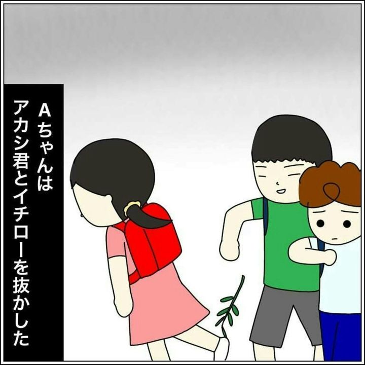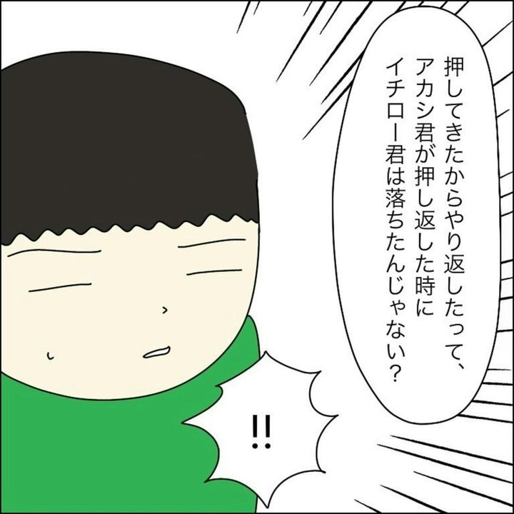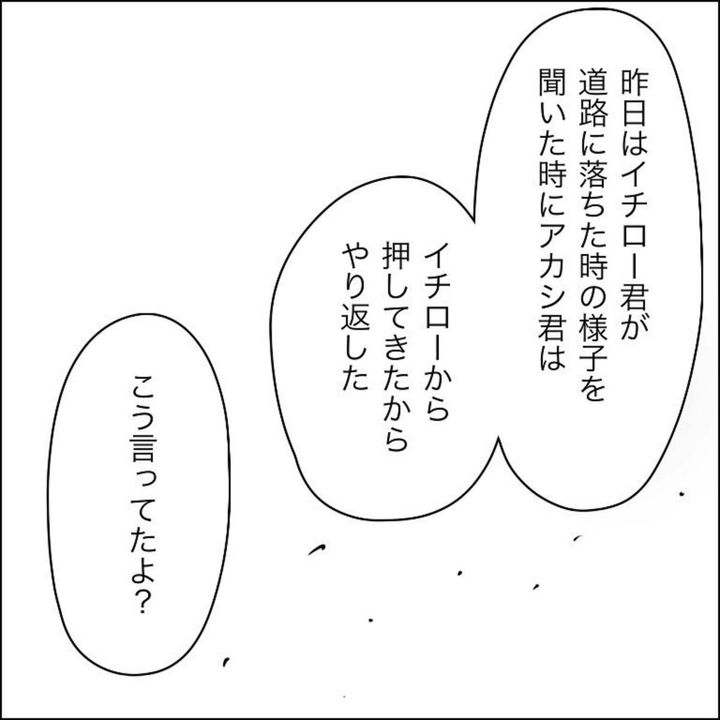 後日、先生が児童を集めて話を聞いたところ、「アカシくん」という男子児童が何か知っている様子でした。アカシくんは「勝手に落ちた」と言ったかと思えば「押されたからやり返した」などと、つじつまの合わない主張をします。