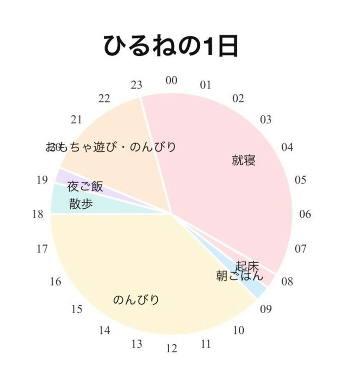 のんびり枠の面積に思わず笑ってしまいますね。元気なイメージがあるワンちゃんですが、ずいぶんゆったりとのんびりな毎日を過ごしているようです。こんな毎日を送ってみたいと思ってしまう人もいるでしょう。1日の半分以上をのんびり枠で埋めてみたいですよね。