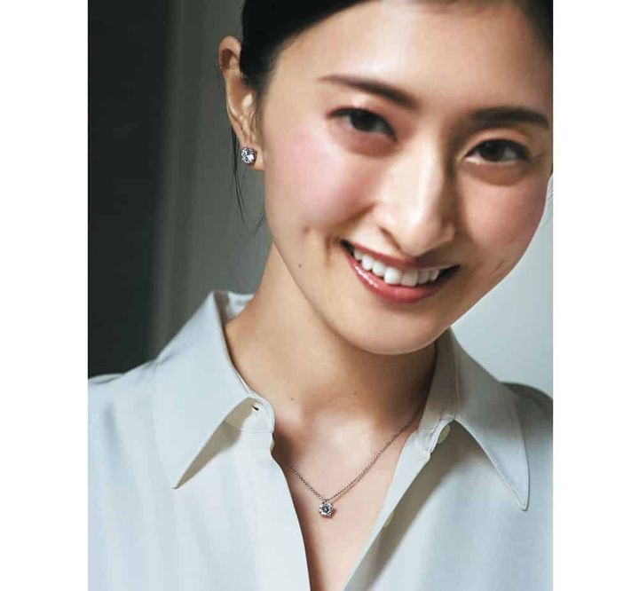 ダイヤモンドのサイズ違いで揃えているグラフのネックレスとピアス。極上のダイヤモンドならではのクリーンな煌めきを放ってくれます。カルティエのウォッチは大学生の頃に自分で買いました。服はシンプルなデザインが好みで百貨店で買い物をしたり、時にはネット買いすることも。今日の白ブラウスはザ・ロウ。