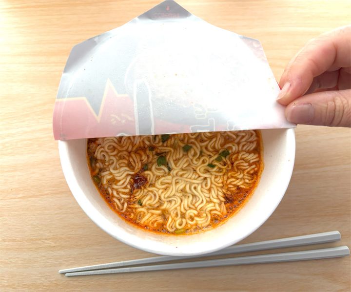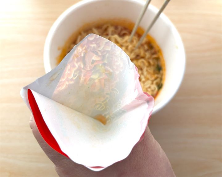 今回は、辛い味のカップ麺を使ったので、このフタカップに入れることで辛みの強い汁も切れています。