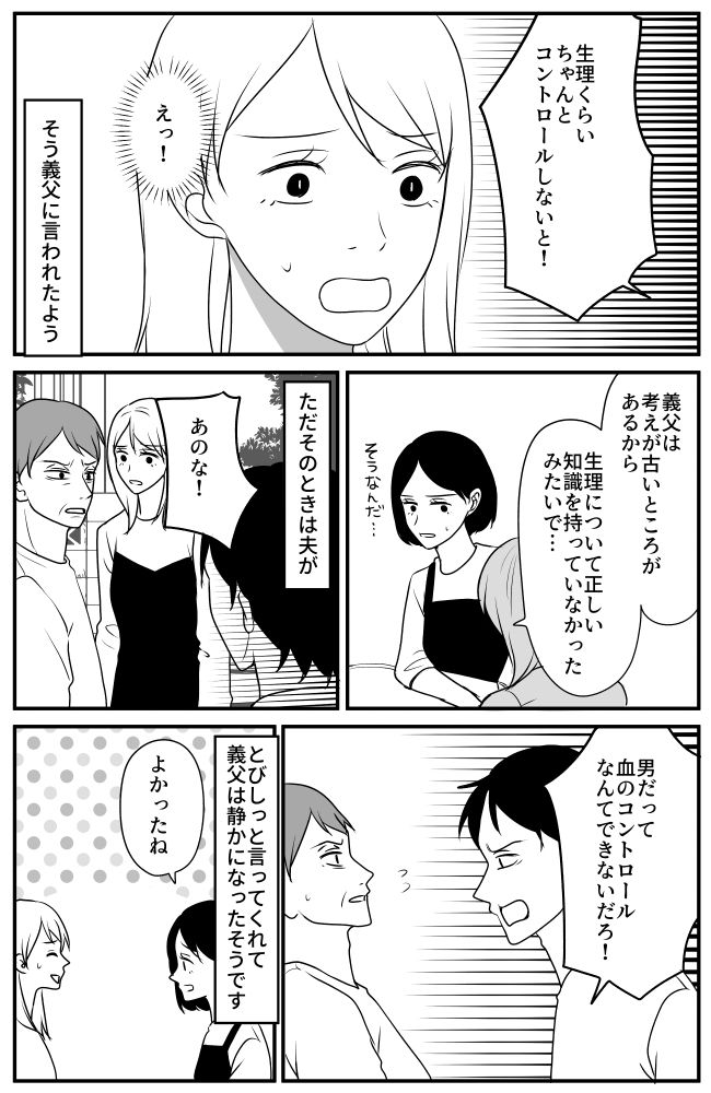 友人によると、義父は考えが古いところがあり、生理について正しい知識を持っていないよう。ただ、そのときは友人の夫が、「男だって、血のコントロールなんてできないだろ!」とびしっと言ってくれ、義父は静かになったそうです。