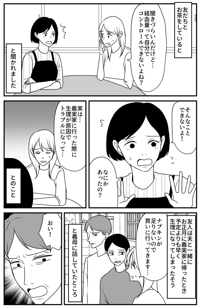 友人は夫と一緒にお正月に義実家に帰ったとき、予定よりも早く生理になってしまったそう。手持ちのナプキンだけでは足りなくなり、「買いに行く」と義母に話していたところ、義父から「生理くらいちゃんとコントロールしないと!」と、言われたとのことでした。