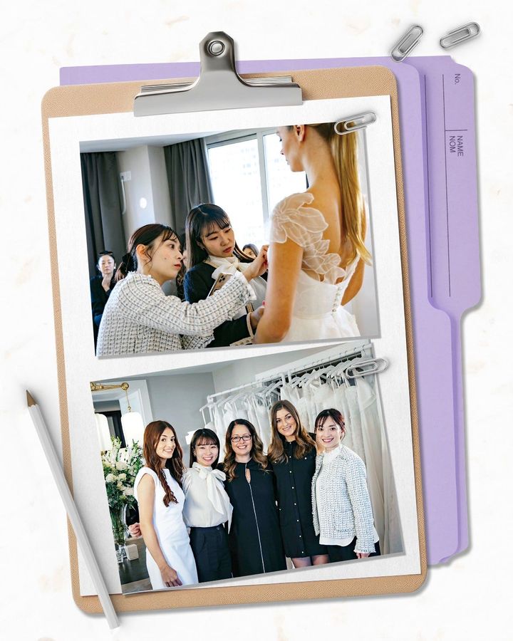 「ロンドン発のスザン・ネヴィルの展示会では、オリジナルの生地や女性のラインを美しく見せる仕立てに圧倒されました。私たちの希望を詰め込んだコラボドレスの製作をしています」