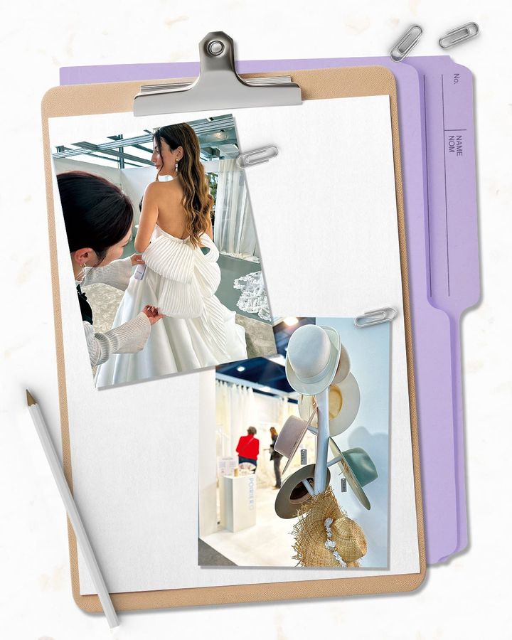 「ヴィクトリアの展示会では、紙細工の折り目からインスピレーションを受け、ミカドやシルクオーガンジーに折り目をつけた特殊なネルピュール加工の独自素材に感動(上)。また、全体的なトレンドとして、帽子やベールなどエッジィの効いた+1アイテムが気になりました(下)」