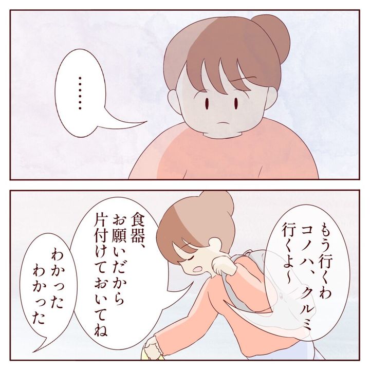 「・・・」何を言ってもムダと無言になった私は、「もう行くわ、コノハ、クルミ行くよ~」と子どもたちに声をかけた後、「食器、お願いだから片付けておいてね」と夫に念押し。すると、「わかった。わかった」とやっぱり適当な返事が返ってきたのでした。