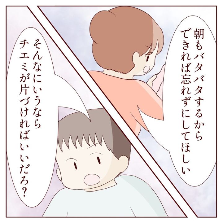 「朝もバタバタするから、できれば忘れずにしてほしい」と伝えると、「そんなにいうならチエミが片付ければいいだろ?」と不機嫌になりながら答える夫を見て、