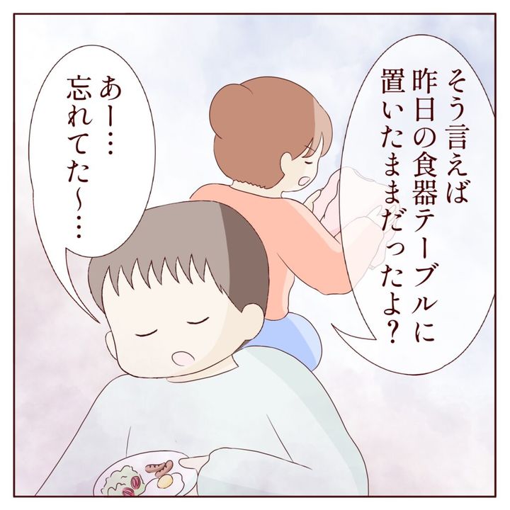 「そういえば、昨日の食器テーブルに置いたままだったよ?」と片付けていないことをチクリと夫に言うと、「あー・・忘れてた~・・」と全く反省もせず、棒読みのセリフのように答える夫に、