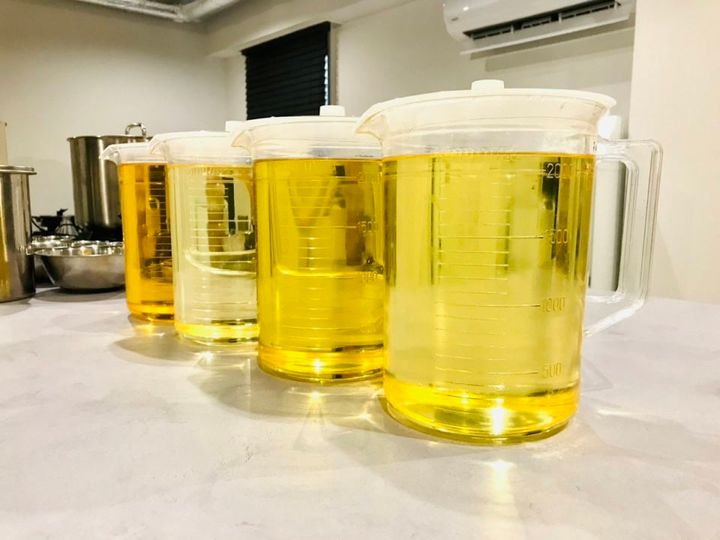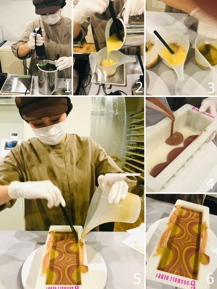 石鹸づくりに密着 ①まずは、苛性ソーダ―をオイルに混ぜます。 ②次に着色し、香料をプラス。③今回は3色使用。 ④型へ流し込んでいきます。 ⑤流し込み終了 ⑥この後、製菓用の回転台を使って、模様を作り込みます。