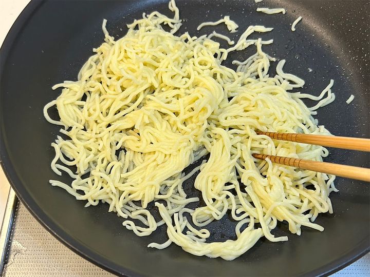 残りのねぎ油をフライパンに引き、麺を炒めます。炒め時間は使用する麺にもよると思いますが、筆者は中火で1分ほど炒めました。水っぽさがなくなればOKです。