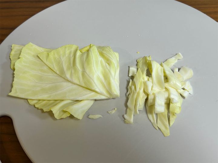 これを5mm幅程度に切っていきます。このくらいの大きさにすることで、キャベツが麺に絡みやすくなって、仕上がりに一体感が出るとのこと。