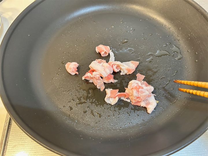 フライパンに4で作ったねぎ油(小さじ1/2)を引き、中火で豚肉を炒めます。