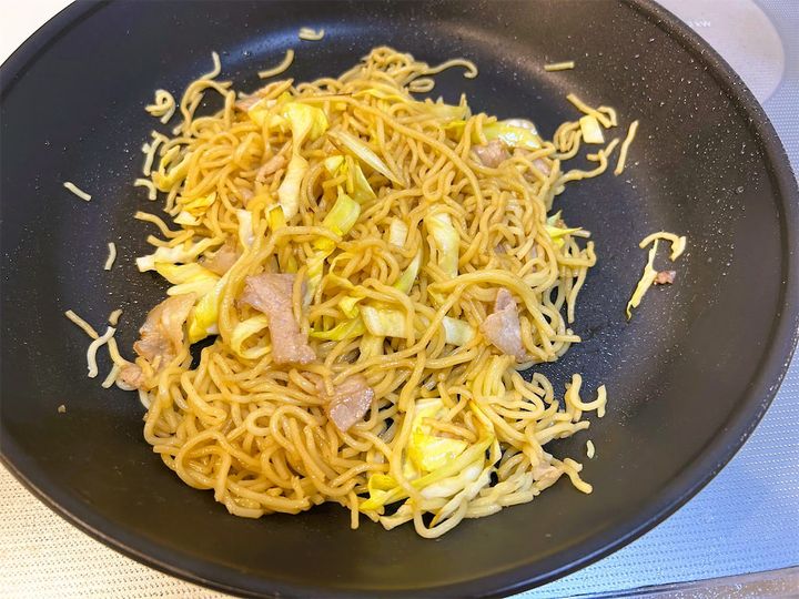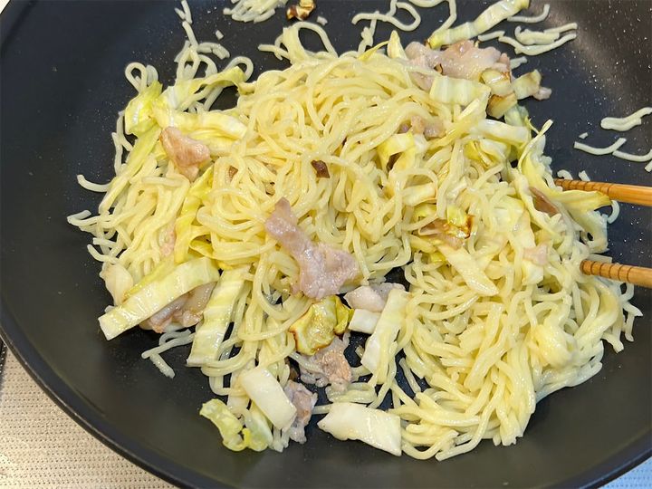 6で炒めた豚肉とキャベツを投入して、麺と馴染ませます。
