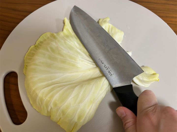 1.まずはキャベツをカットしていきます。芯は包丁の背を使って、軽く潰しましょう。こうすることで火が通りやすくなるそうです。