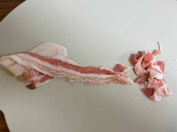 3.豚肉も1のキャベツと同じく5mm幅程度に切ります。