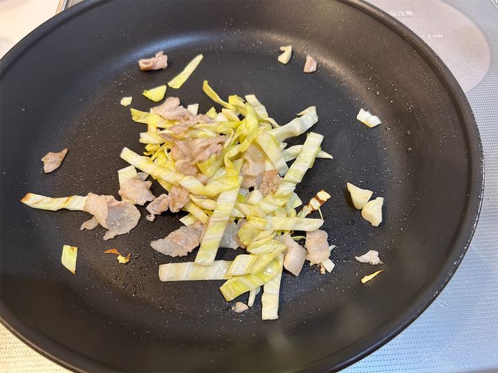 豚肉に焼き色がついたところで、1のキャベツを投入し、さらに炒めます。