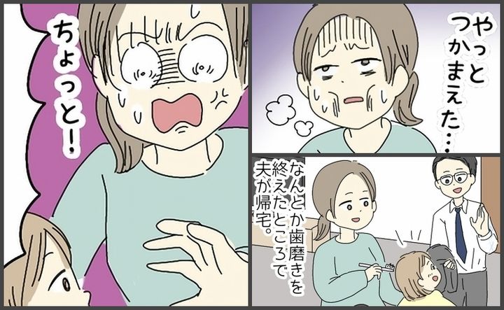 「ちょっと!」嫌がる娘の歯磨きをなんとか終えた私。寝かせたいタイミングで夫が帰宅…そしてまさかの