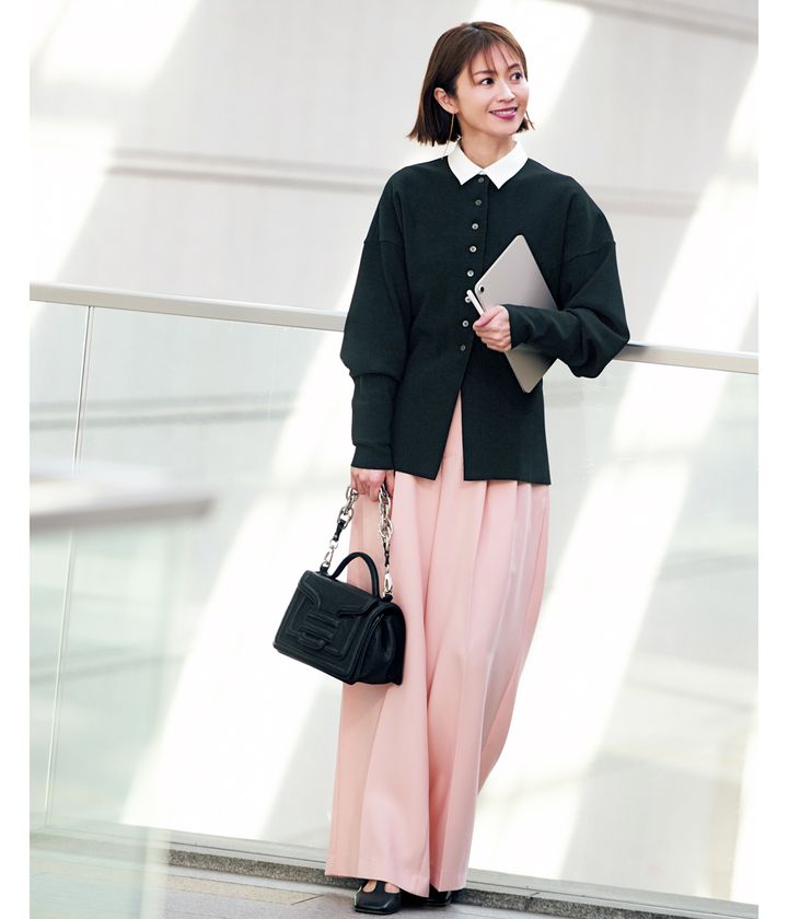 パンツ¥12,100(ミラ オーウェン/ミラ オーウェン ルミネ新宿 2 店)カーディガン¥63,800(ビロット/サードマガジン)シャツ¥17,600(ミースロエ/ミースロエ ルミネ新宿1 店)バッグ¥243,100(ピエール アルディ/ピエール アルディ 東京)シューズ¥155,100(セルジオ ロッシ/セルジオ ロッシ カスタマーサービス)ピアス¥27,500(シャルロットウーニング/フラッパーズ)