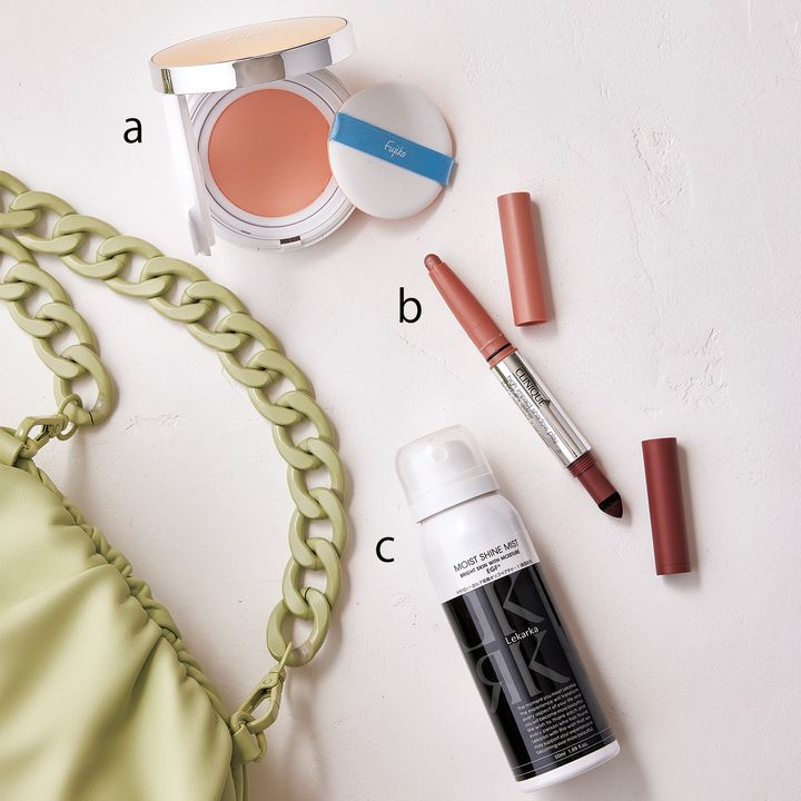 a.皮脂浮きを防ぎながらツヤやかな肌を実現。フジコ あぶらとりウォーターパウダーNEO ¥2,530 (かならぼ)b.少し滲んでも素敵な風合いに。ハイ インパクト アイシャドウ スティック 03 ¥5,280(クリニーク)c.瞬時にツヤUP。ミニブライトリーモイストシャインミスト 50ml ¥5,500 (レカルカ)