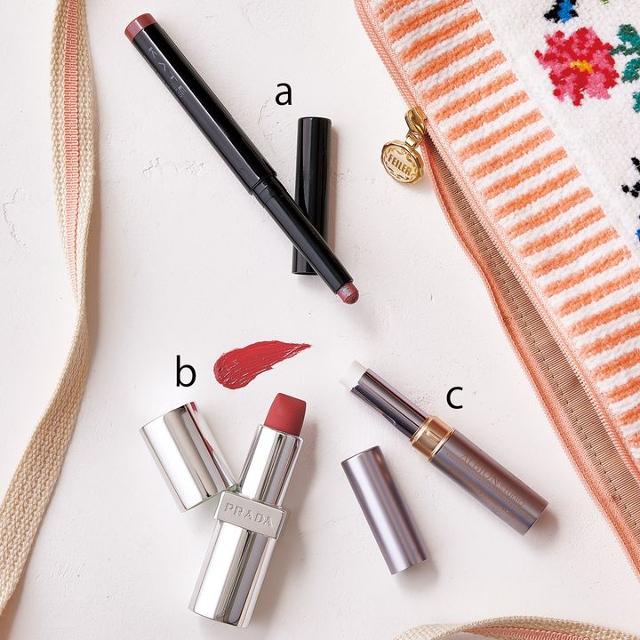 a.ケイト マグネットスティックシャドウ EX-1 ¥1,430 (限定)〈編集部調べ〉(カネボウ化粧品)b.直塗りすることで瞬時に今っぽさを。リップ バーム オプティマイジング ケア U013 ¥7,260(プラダ ビューティ)c.テカリや毛穴の凸凹をカバー。アルビオン スタジオ ポアカバー パウダー スティック ¥3,850(アルビオン)(限定)