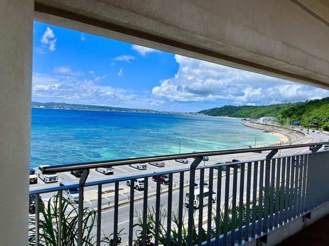 目の前に広がる、エメラルドの名護湾が絶景ポイント。真っ青な海を眺めているだけで、心が穏やかになります。