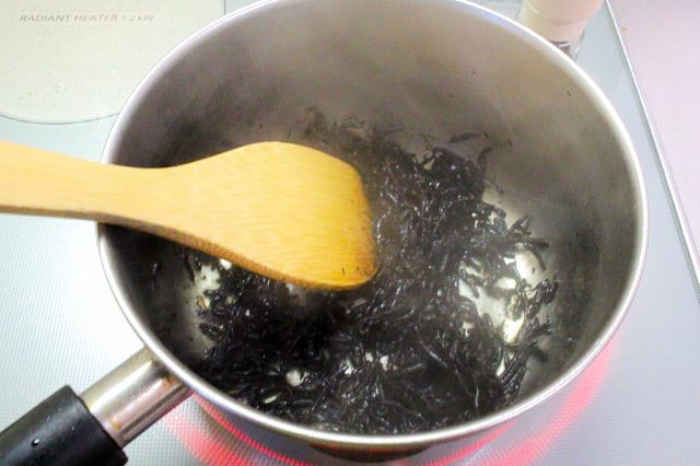 15分経つとひじきから色が出て、少し芯が残るくらいに戻っていたので、ここからレシピ通りに作ってみます。