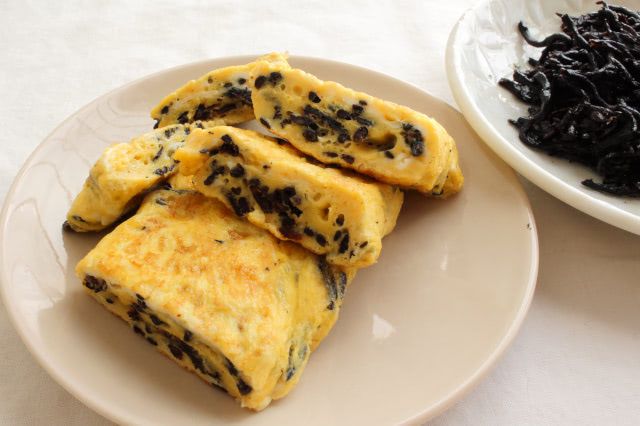 「ひじきのオイル炒め入り卵焼き」が、こちら。黄色い卵に黒いひじきが映えますよ♪