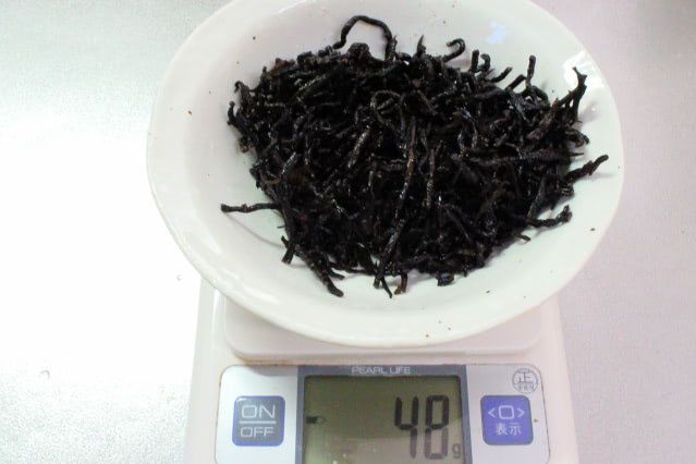 水気を切って計量すると、乾燥ひじき11gが48gになりました。2g少ないですが、オリーブオイルは分量通り、大さじ2で炒めてみます。