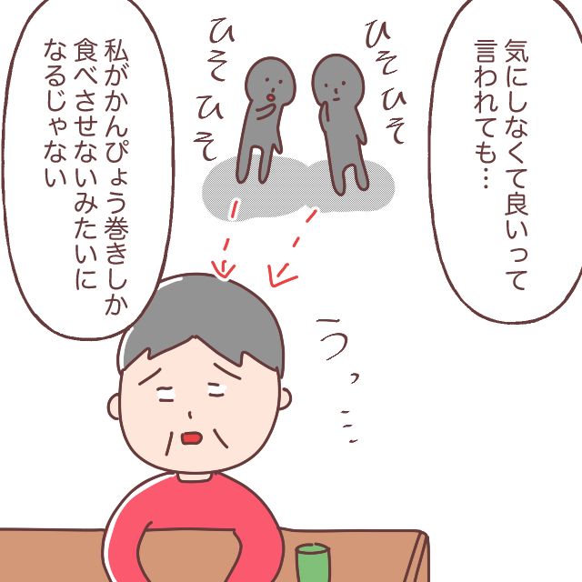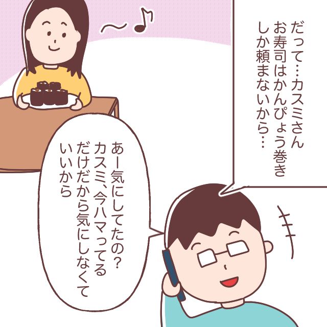 ダイキの反応は、ごまかしているようには聞こえませんでしたが、やっぱり周りの視線が気になる私。「気にしなくても良いって言われても・・・私がかんぴょう巻きしか食べさせないみたいになるじゃない」とダイキに心配していたことを伝えました。