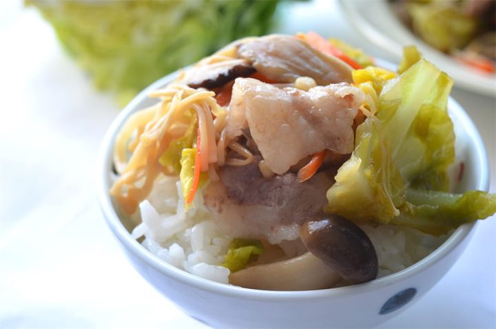 2. きのこは石づきを取り、食べやすい大きさに割いて1の上に重ねる。さらにその上に豚肉を重ねる。