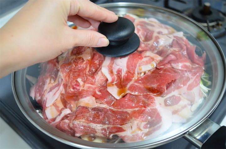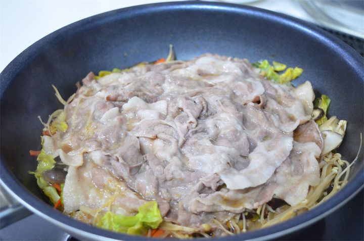 3. すき焼きのタレを薄めずに全体に回しかけ、フタをして5~6分ほど中火で蒸し焼きにする。