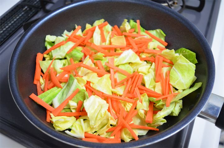 1. キャベツはざく切り、にんじんは5cm長さの拍子木切りにしてフライパンに敷き詰める。