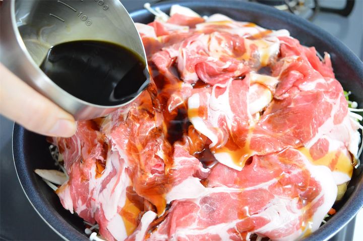 今回、すき焼きのタレ100mlを薄めずに入れましたが、春キャベツときのこからたっぷり出た水分でちょうどいい味に仕上がりました。