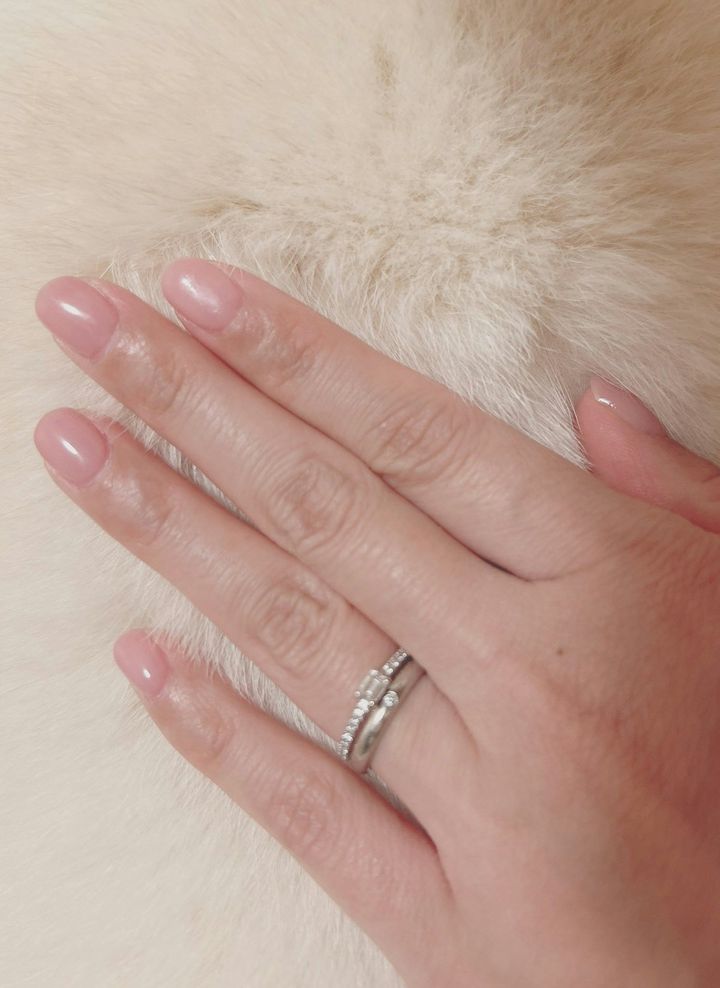 白柴もち吉さんが選んだ背景は、なんと愛犬のボディ。白くてふわふわだから、背景には最適だったのでしょう。それにしても、じっとして協力している愛犬がかわいらしいですよね。とてもお利口さんです。そのおかげか、撮ったネイルの写真もとても素敵に見えます!