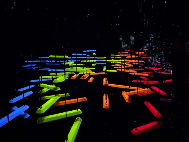 「エアリアルクライミング」はロープでつられた棒が空中に立体的に浮かんでいる空間です。ロープにつかまりながら落ちないように空中を立体的に渡っていくスリリングな作品です。バランス感覚を保ちながら体感する空間です。視覚で楽しみながら握力、脚力とバランス感覚が養われそうな空間です。