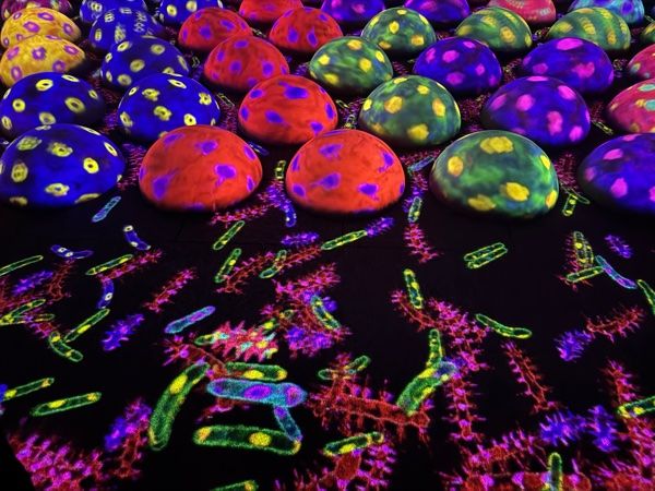 同じ色の球体を踏むとあおむしが誕生するインパクトのある空間で、印象に残る作品のひとつです。ボールを踏む感触と音を知覚しながら進んでいく過程が刺激的でアスレチック的な空間です。