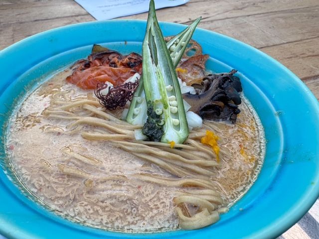 チームラボ新エリアは身体を動かす作品が多いので体験した後は小腹も空きます。 ミュージアムの屋外スペースにあるVegan Ramen UZU Tokyo(ヴィーガンラーメンウズ トウキョウ)でヴィーガンラーメンの「味噌ラーメン Vegan UZU style 東京店限定」を頂きました。スープは味噌で生姜やニンニクの風味もありコクがあります。野菜のトッピングのボリューム感もあり、お腹も満たされました。