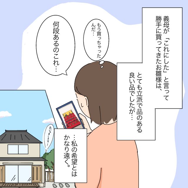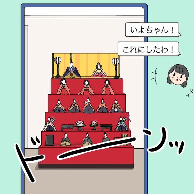 まさか相談もなく買ってしまうとは思っていなかったいよさんにとって、5段飾りのおひな様は衝撃ですね。いよさんの家はマンションですし、飾る場所の確保が難しそうです。立派なおひな様を孫に買ってあげたい気持ちは嬉しいですが、いよさんが気に入って買いたいおひな様を見せていたのにダメ出しをされ、ひなちゃんがお人形を怖がると話していましたがお義母さんには全く通じていなかったようですね。