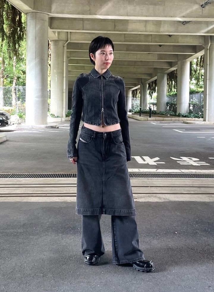レイヤードスタイルのヌケ感として、ほんのり「腹チラ」が効いてくるスタイリング。オーバーサイズのジャケットを羽織っているので、露出も抑えられてマネしやすい!