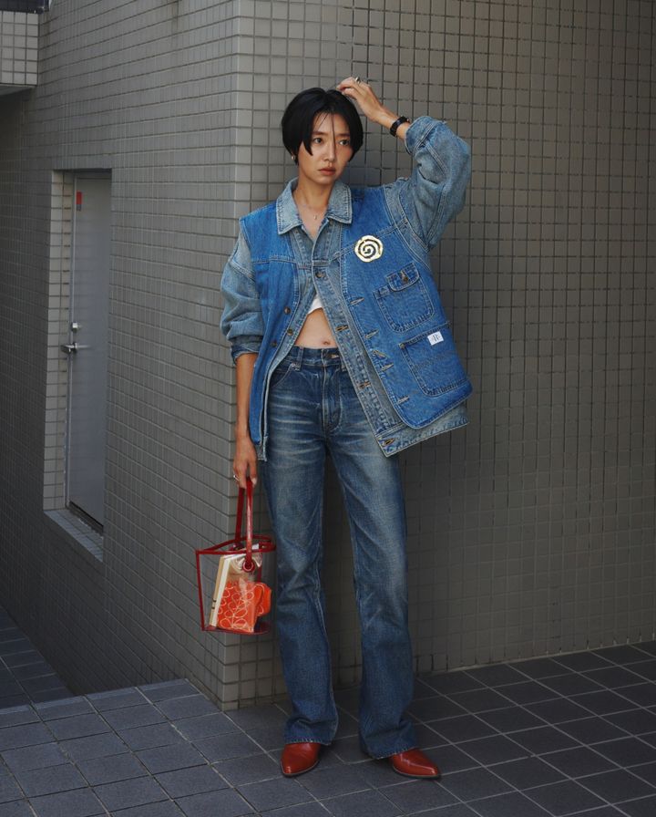 トレンドワードのひとつでもあるデニムonデニムコーデ。野暮ったくならずに着こなすカギは、ヌケ感を意識した肌見せバランス。首もとのあきや袖をまくって腕を見せるのはもちろん、お腹も見えていることで軽やかさがプラスされています。