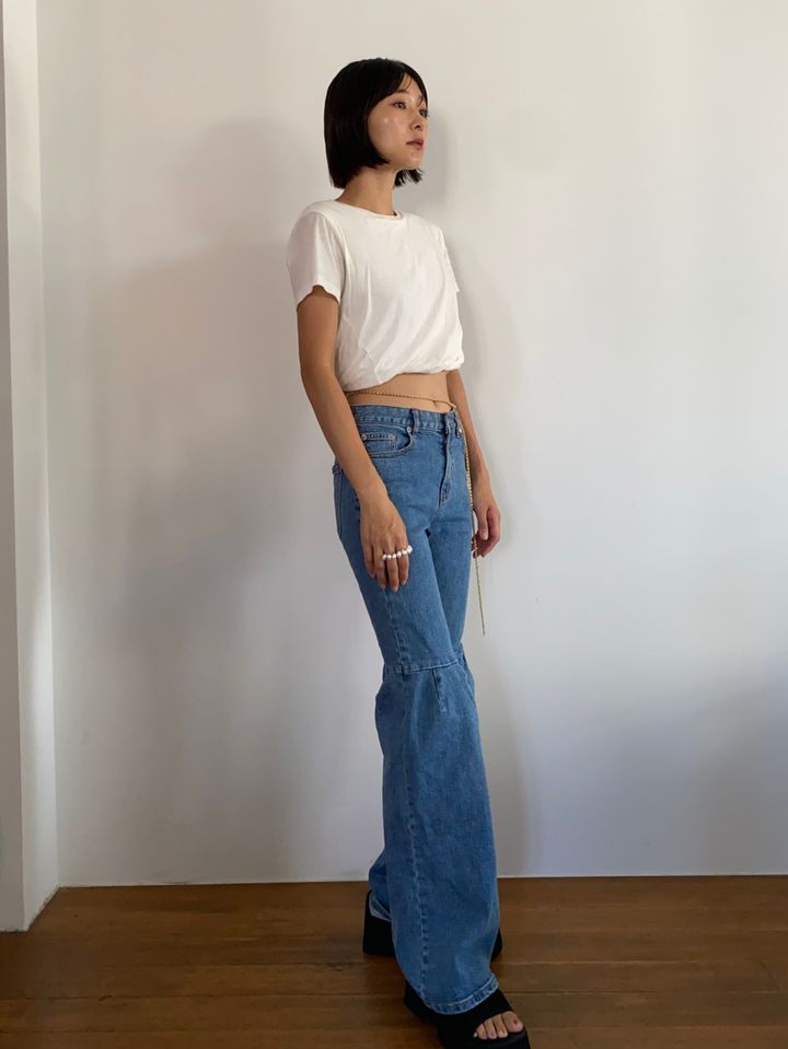ミニマルなスタイリングですが、クロップド丈のTシャツからのぞく肌がこなれたムードに仕上げてくれてます。Y2Kムードのあるボディチェーンで、ヘルシーに仕上げて。