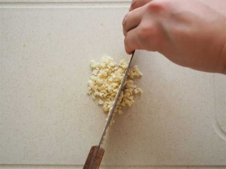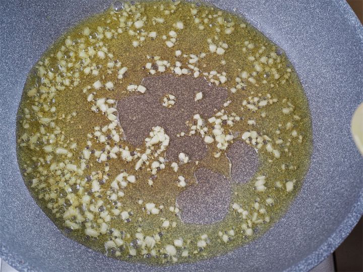 7. フライパンにオリーブオイル(大さじ1)を入れ中火弱で熱し、にんにくを炒める。