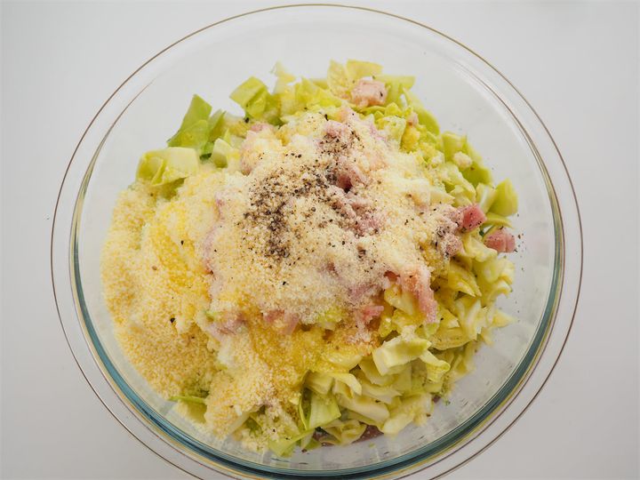 5. 大きめのボウルに123、粉チーズ、黒こしょう、塩、オリーブオイル(大さじ1)を入れよく混ぜ合わせる。