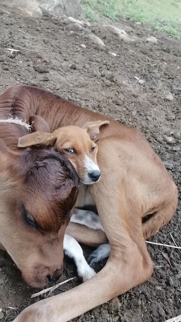 保護されて牧場の仲間に加わった子犬と大親友になった仔牛。 この子は子犬のことが大好きすぎるあまり、ギュッと抱きしめて離そうとしません!!