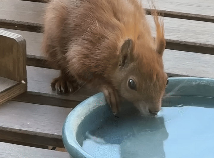 3. 暑い日のおもてなし! お水とナッツをもらって帰るリスさん