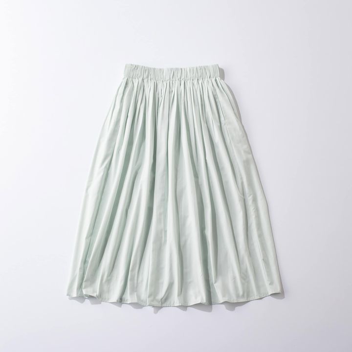 生地の光沢感とギャザーたっぷりのボリュームシルエットで、高見え必至のロングスカート。ペールトーンのミントグリーンが、春夏コーデに清涼感を与えて爽やかに更新してくれます。ウエストがゴムだから、エフォートレスなご近所コーデにももってこい。どんなトップスでも受け止めてくれる、ポテンシャル最強の1枚です。