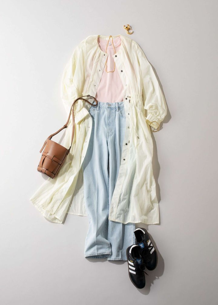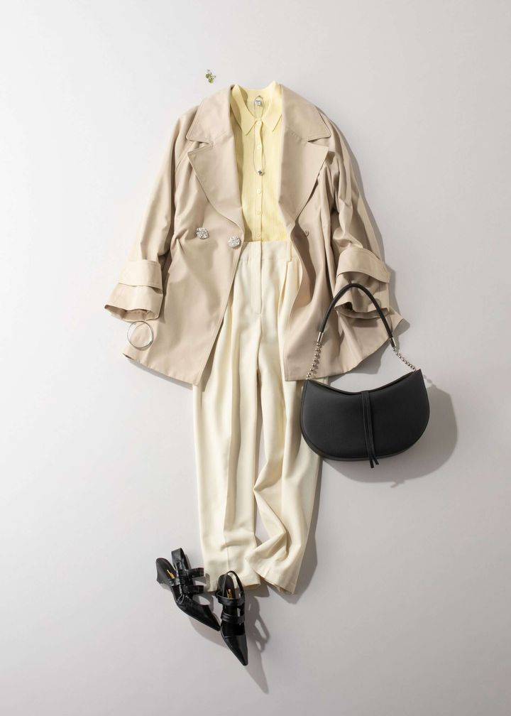 お仕事シーンできちんと感を出したい時は、トレンチやタックパンツなど正統派アイテムでキレイめに。イエローと同じ優しいトーンでまとめれば、仕事も穏やかな気持ちで乗り切れそう。