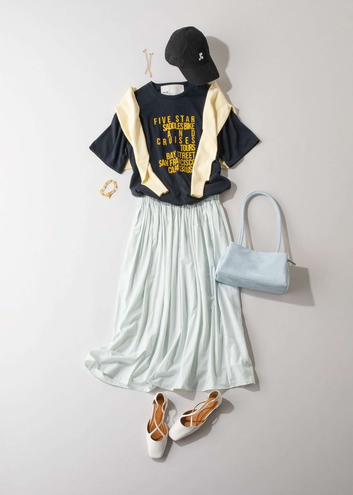 ロゴTやキャップで思いっきりカジュアルに振っても、ちょうど良い女っぽさに調整してくれる頼もしさ!小物で淡いカラーを散りばめて、キャッチーでこなれた雰囲気に。